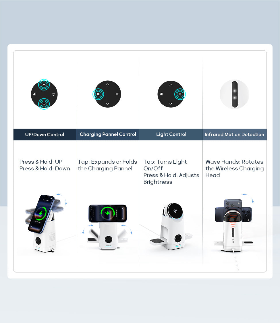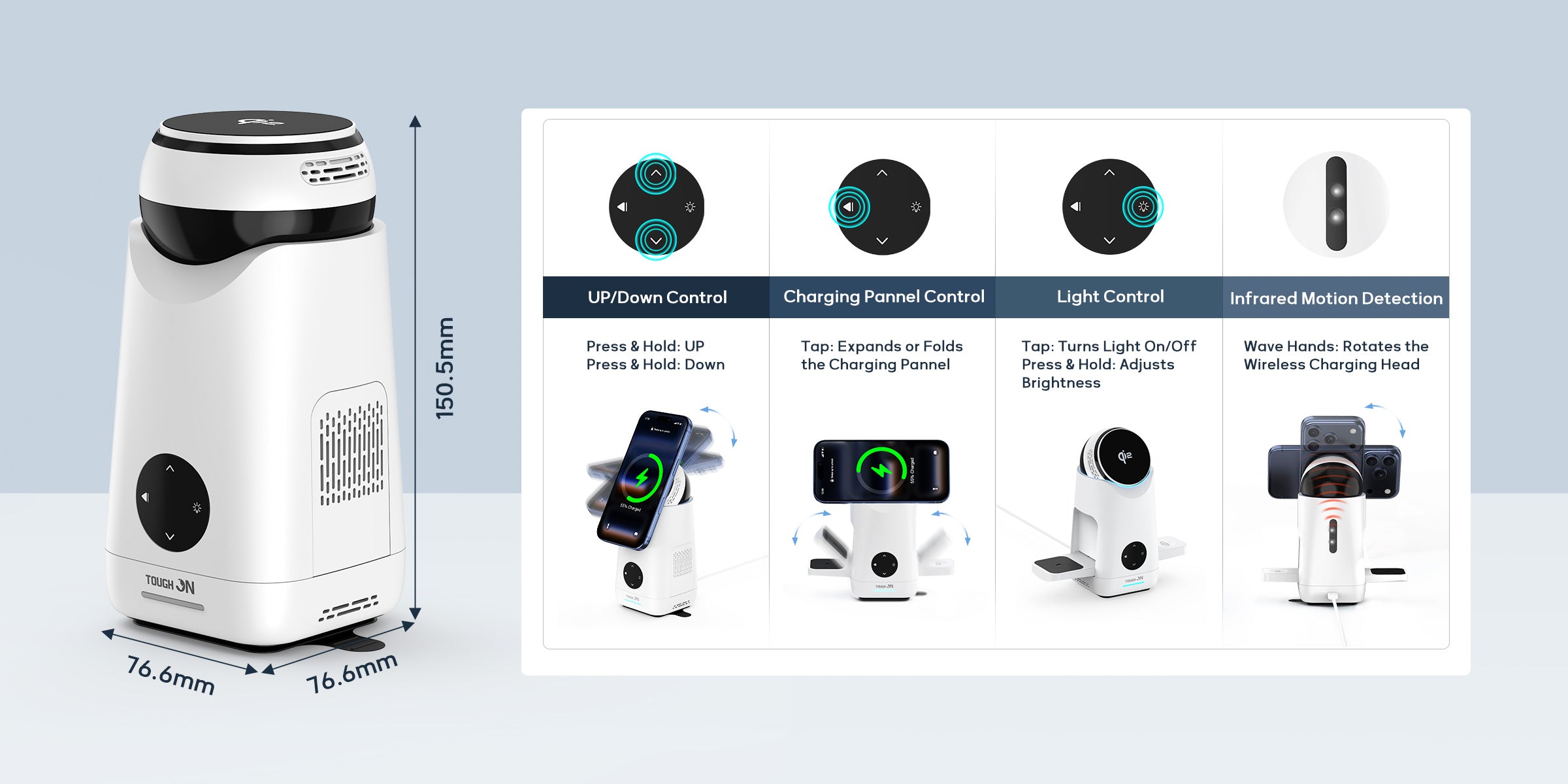 The smooth, rotating base allows easy access from any direction, while the non-slip silicone pad keeps your setup secure and stable. Compact and clutter-free — ideal for your bedside table, office desk, or kitchen counter.