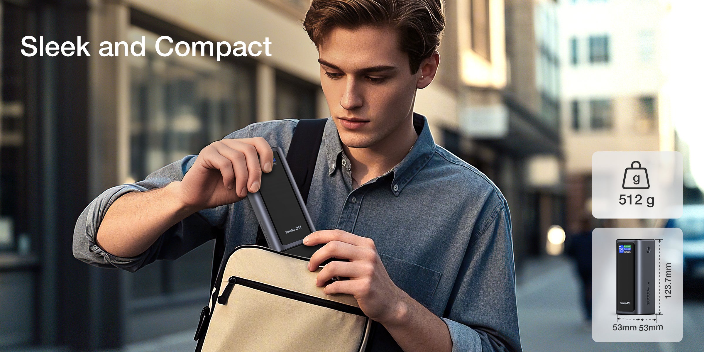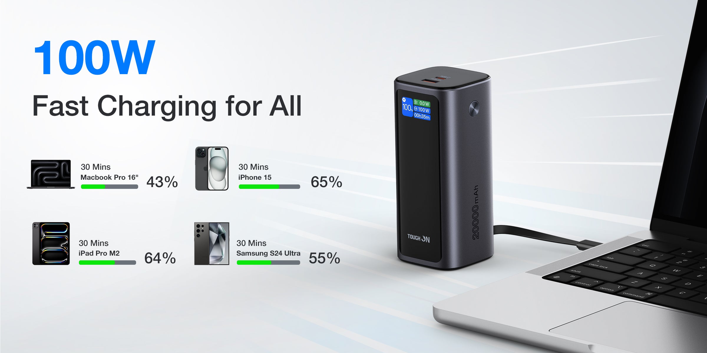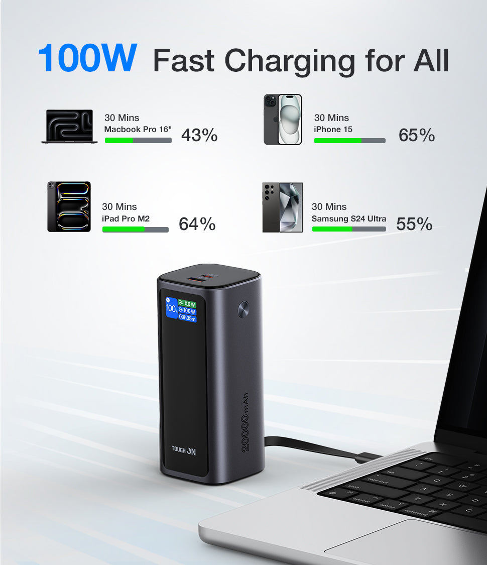 20,000mAh Long-Lasting Power Supply: The ultra-large 20,000mAh capacity provides multiple charges for your devices, ensuring you stay powered throughout your journey. Equipped with 100W ultra-fast charging, it can charge a MacBook Pro 16" up to 43% in just 30 minutes.