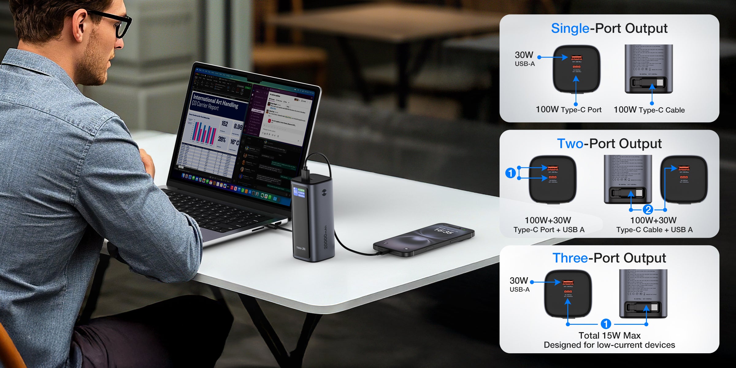 Built-in Retractable Cable for Easy Portability: Comes with two USB-C cables, delivering up to 100W output to quickly charge your MacBook or any USB-C laptop anytime. One built-in retractable USB-C cable extends up to 60cm and withstands over 20,000 bends, while the additional external USB-C cable measures 100cm for greater flexibility.