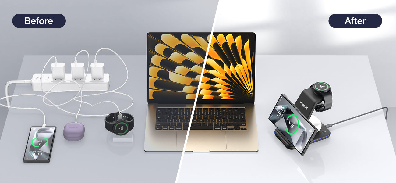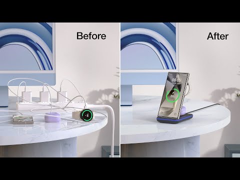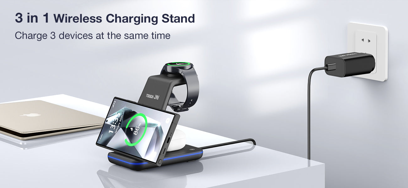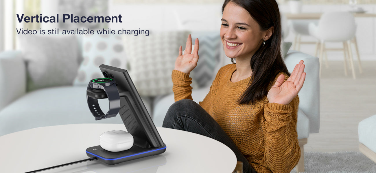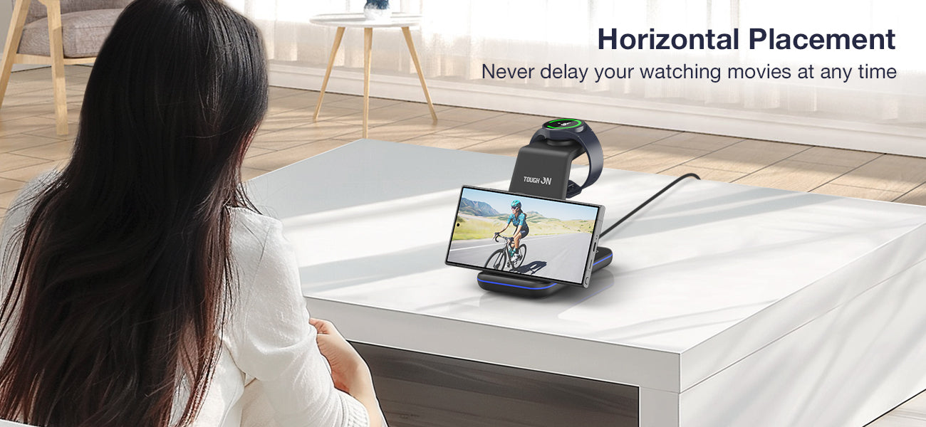 - Catering specifically to Samsung product users, our 3 in 1 wireless charging station allows you to wirelessly charge your Samsung Galaxy phone, Galaxy Watch, and wireless earbud all at once using just one USB-C cable. Say goodbye to the tangled cord hassle of the past!