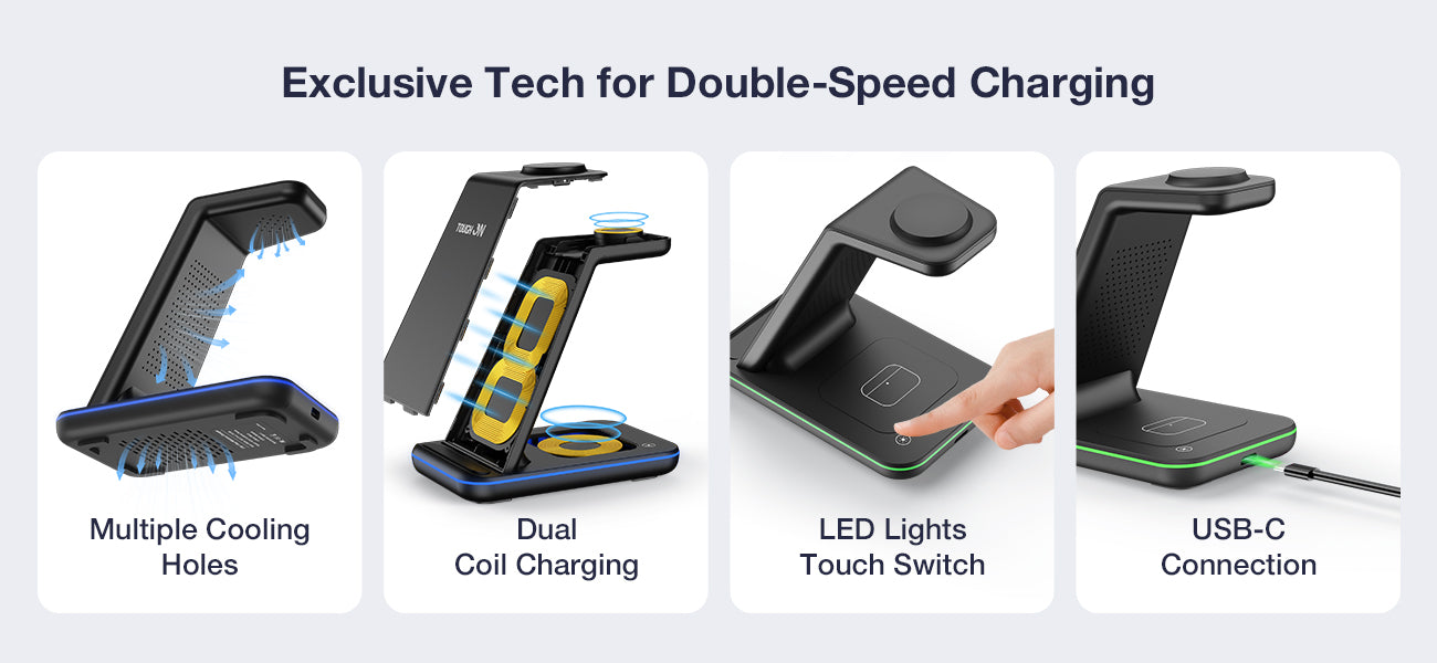 - The wireless charger stand features dual coils for expanded charging in portrait and landscape modes, allowing uninterrupted streaming and messaging without unplugging your phone. It also doubles as a versatile charger stand, freeing your hands.