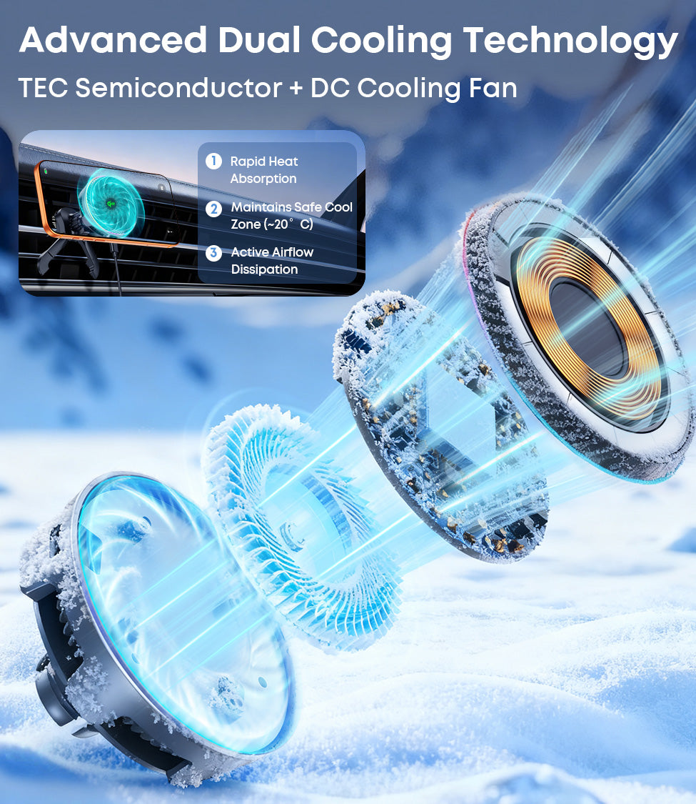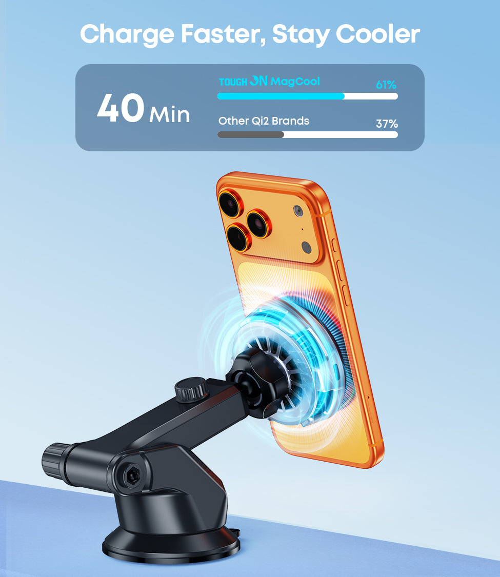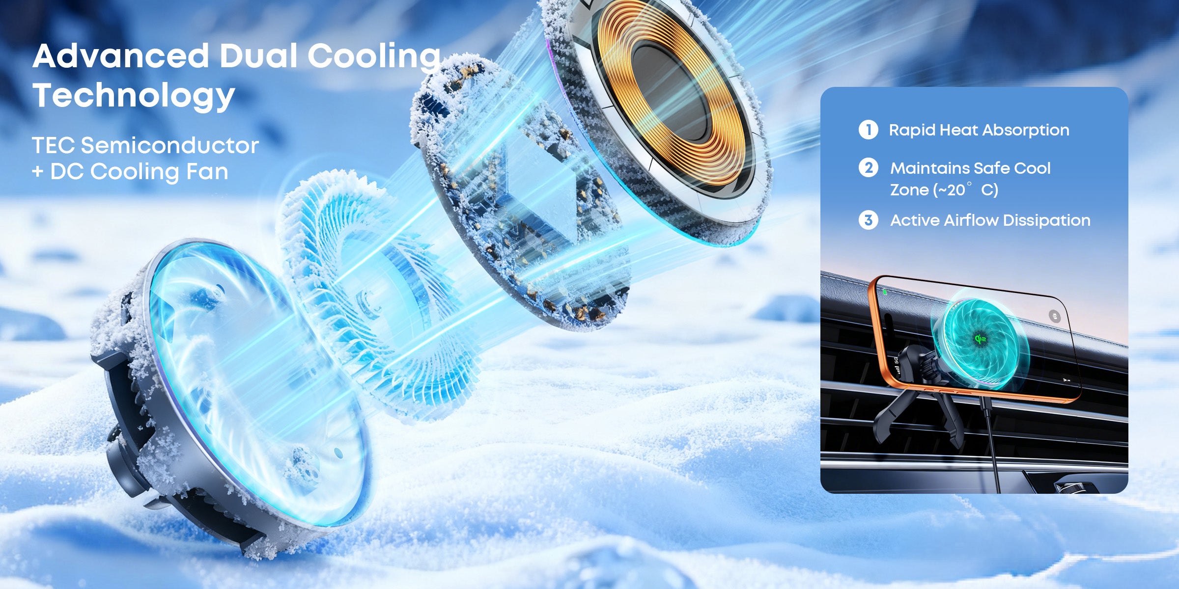 This advanced dual-cooling system keeps your phone as cool as 20°C, preventing overheating, protecting battery health, and maintaining maximum Qi2 fast-charging speed — even on long drives.