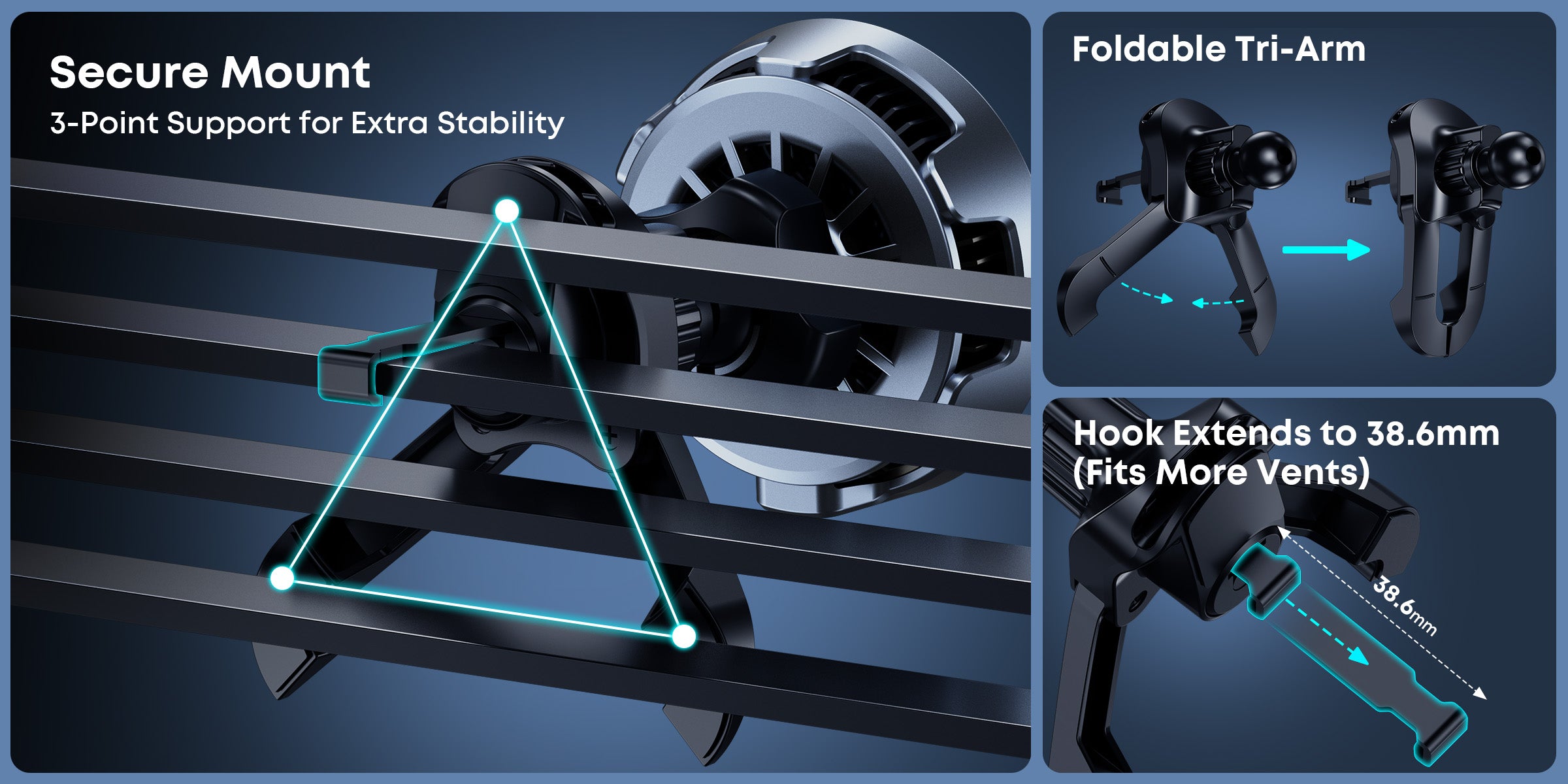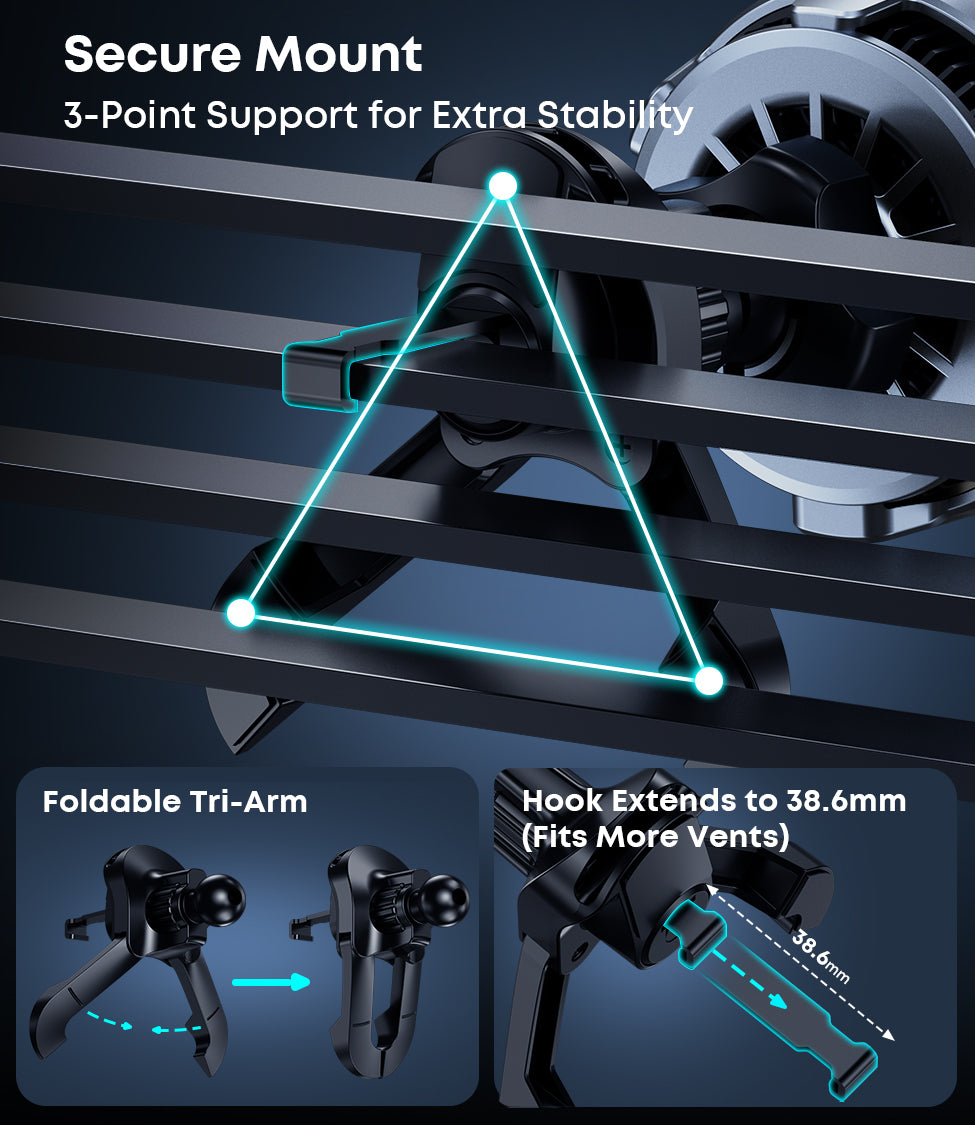 The upgraded vent clip features three-point support and adjustable angles, keeping your phone steady and within easy reach.