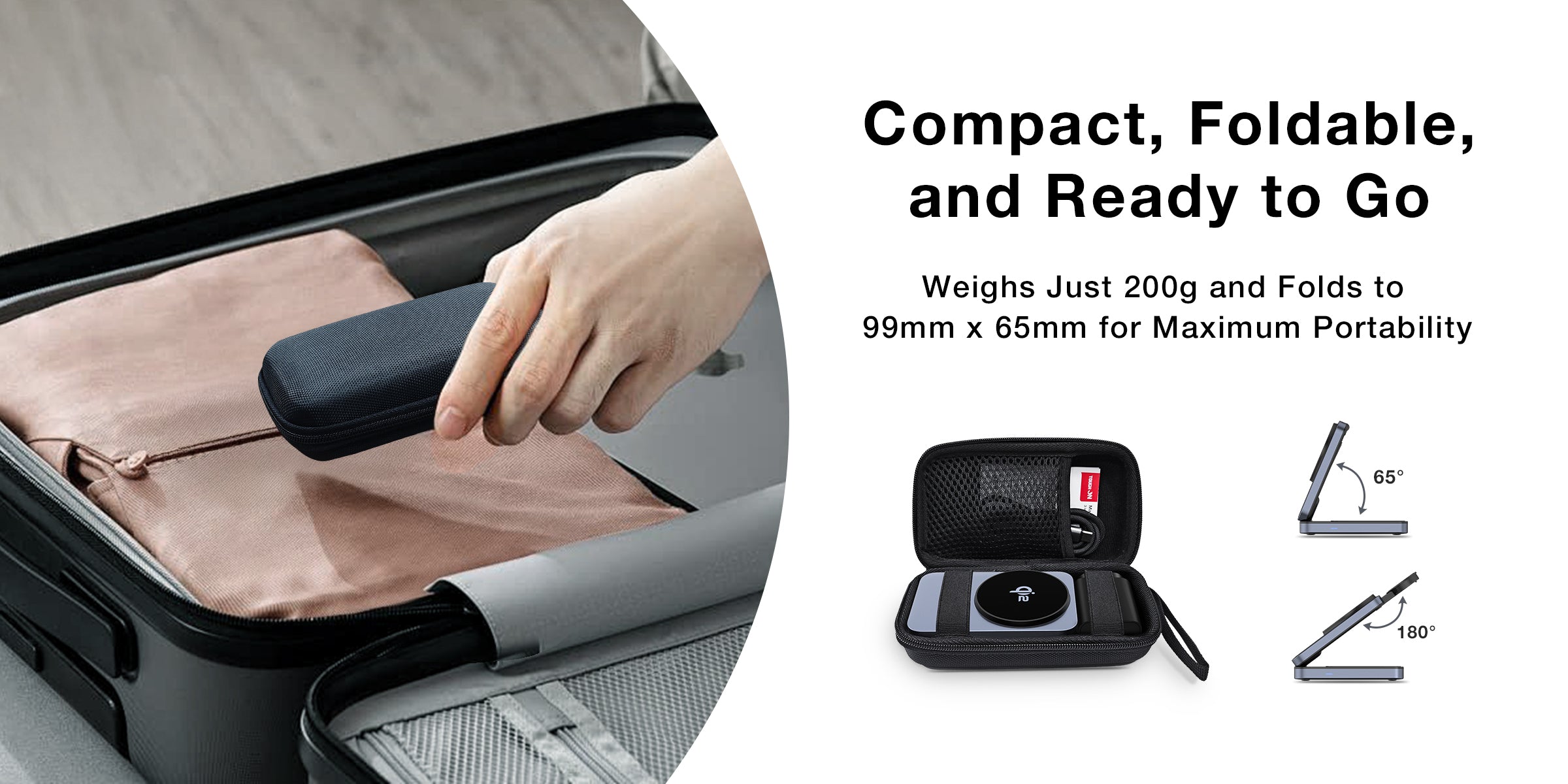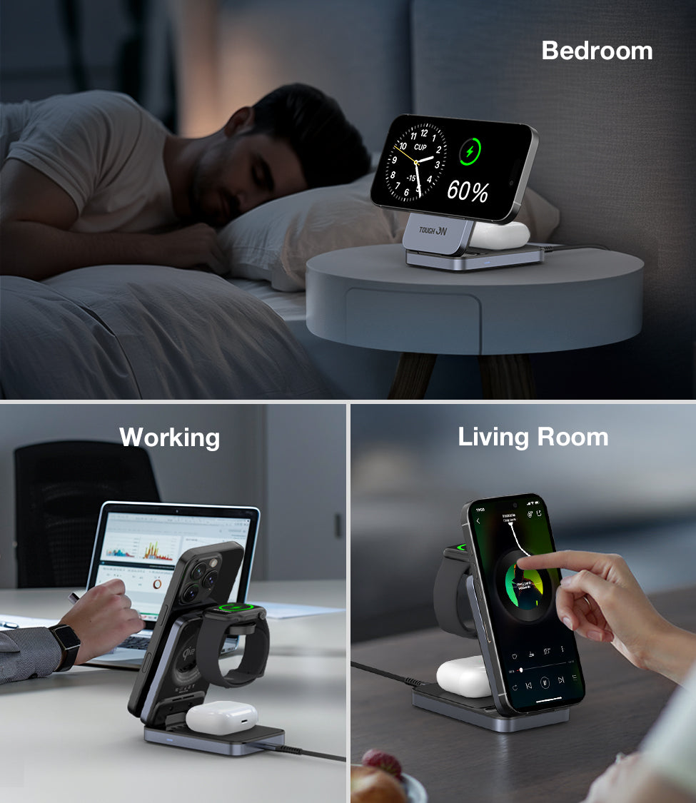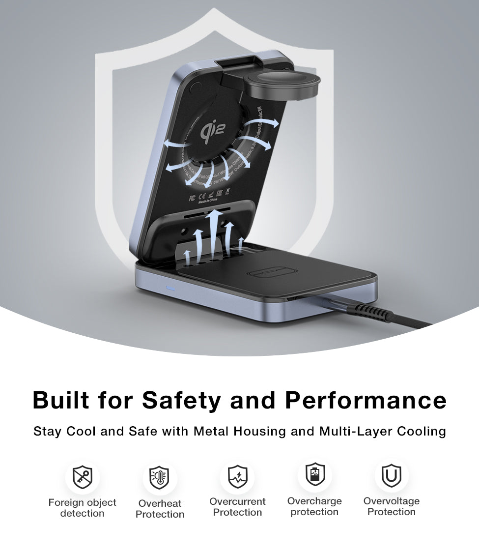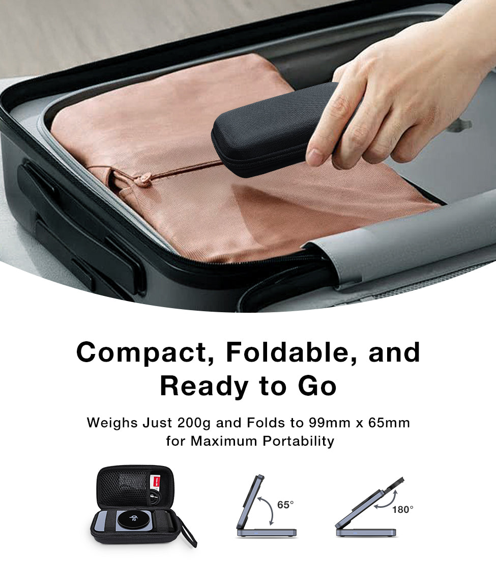 Compact Foldable Design for Travel: Lightweight and easy to carry, this wireless charging station folds into a compact size, making it ideal for travel or your busy lifestyle. It includes a handy travel case to keep everything organised—no more tangled cables.